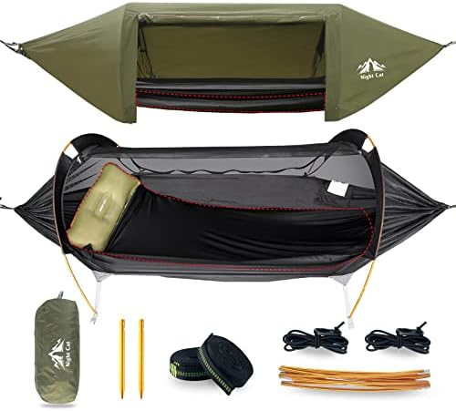 Choose the Night Cat Camping Hammock Tent with Mosquito Net and Rain Fly, and elevate your outdoor adventures to new heights of comfort and convenience today!,